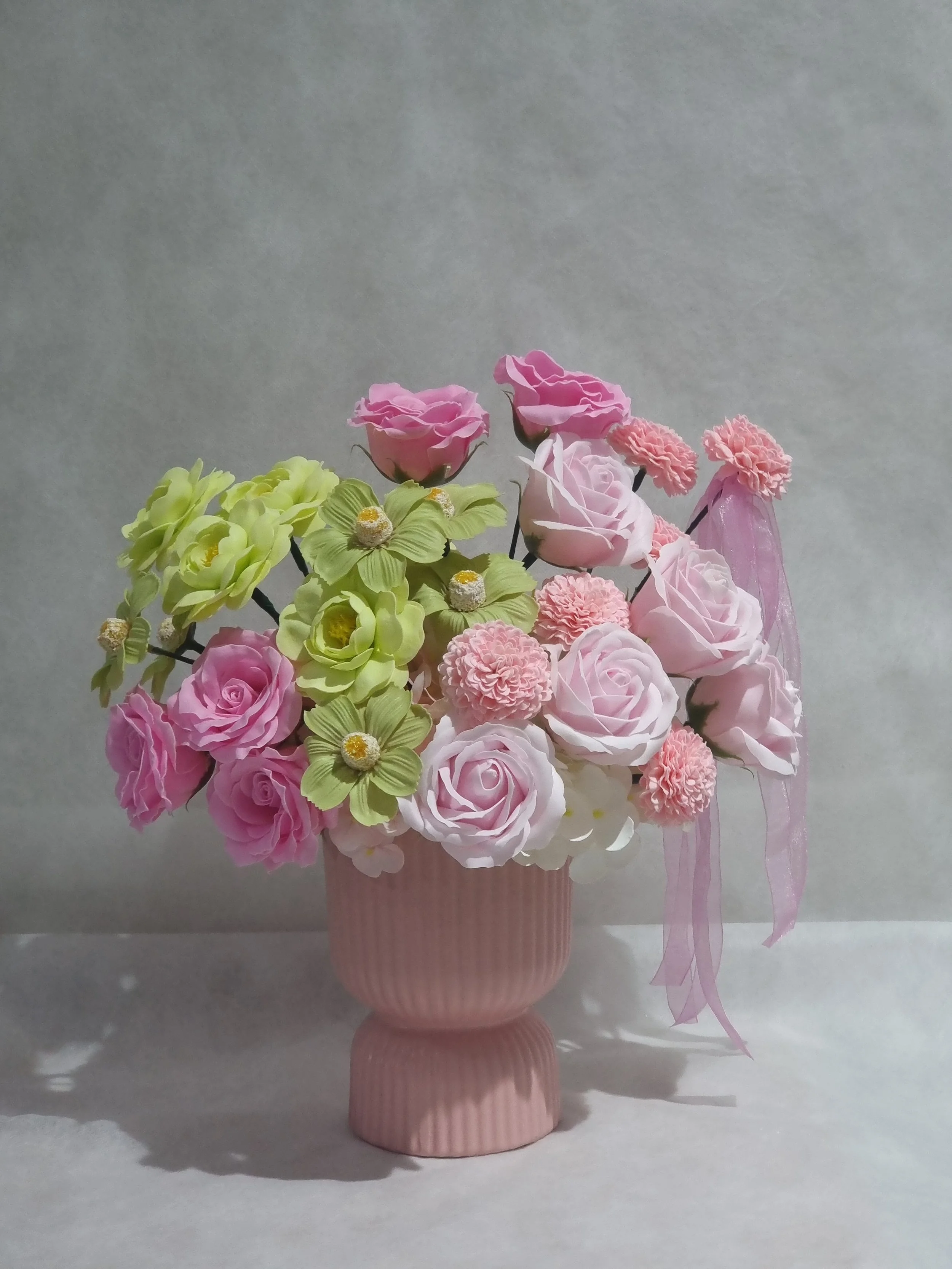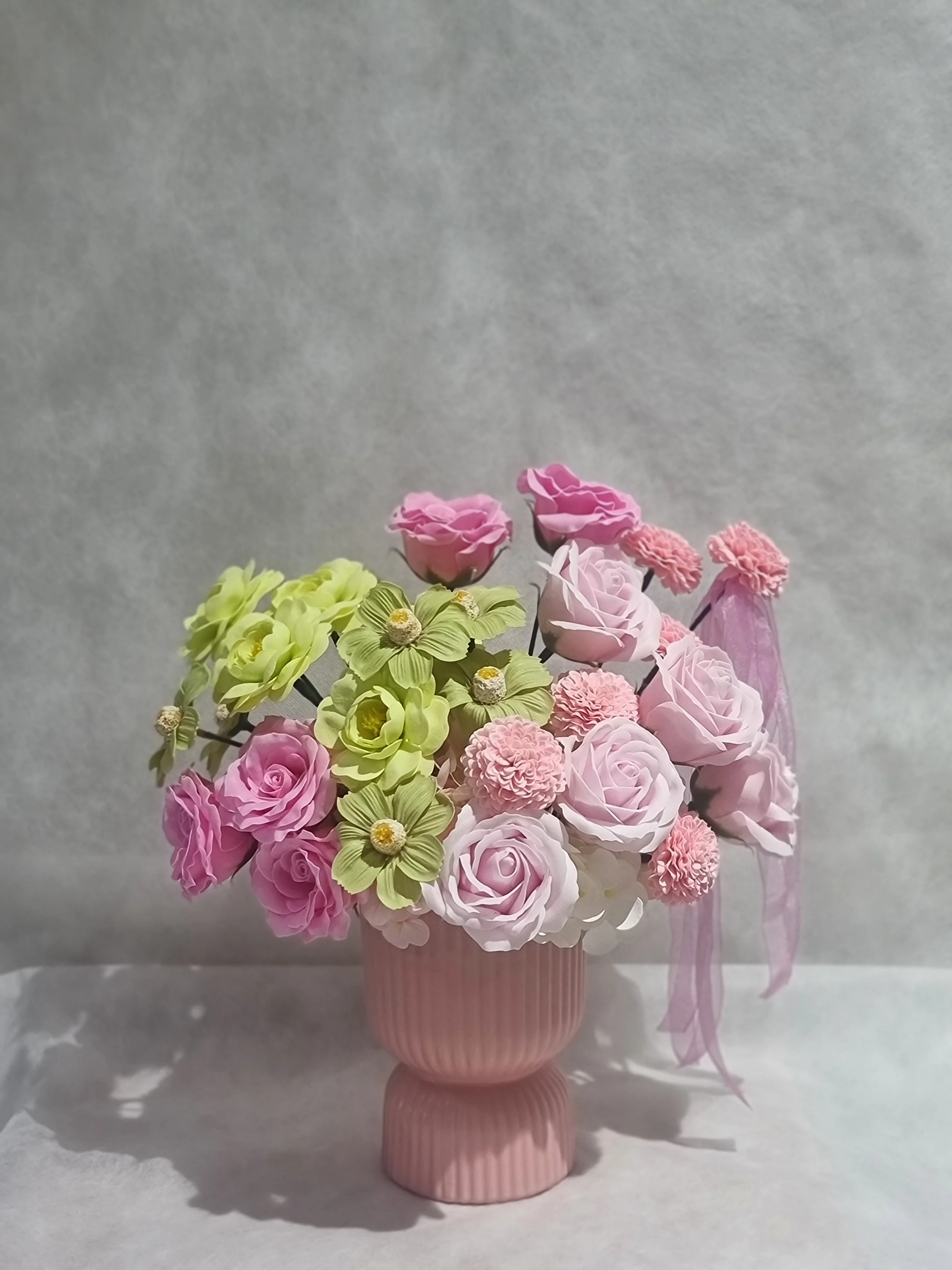 This Pink Cyprus Vase is designed with premium quality artificial flowers in pinks, greens and white Roses, Daisies, Ranunculus, Mini Dahlias and Hydrangeas.