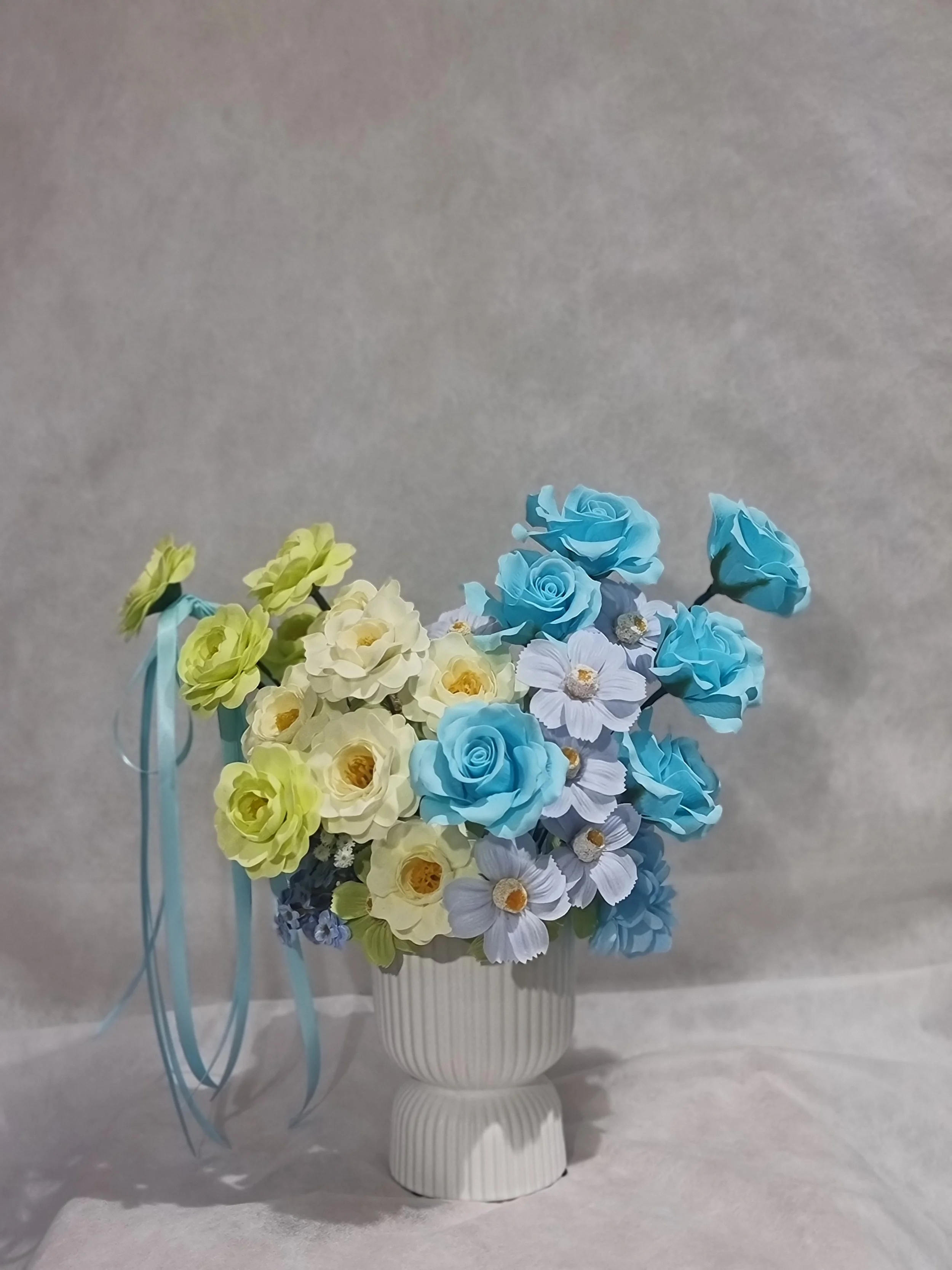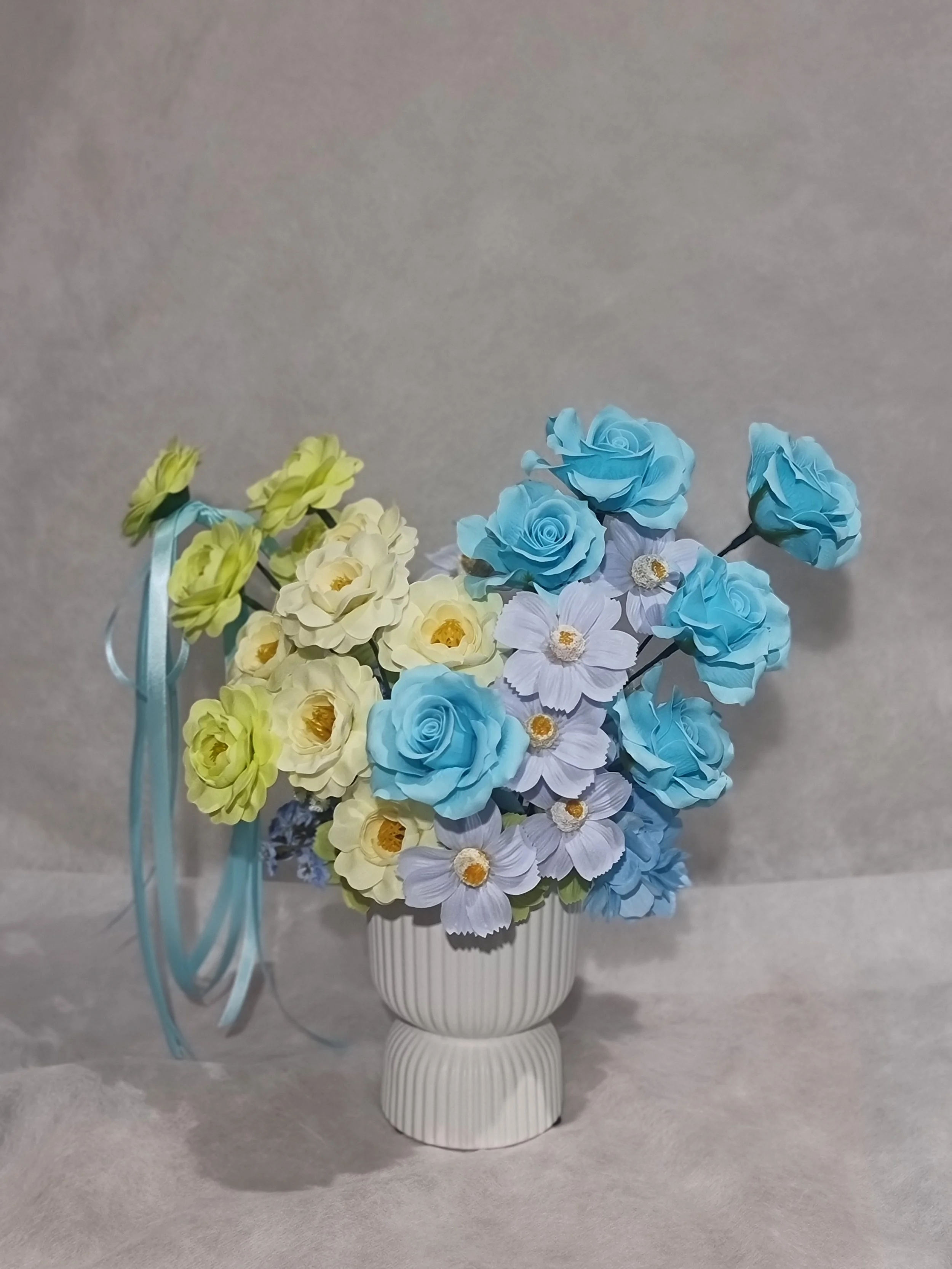 This white Cyprus vase arrangement is designed with blues, cream, and greens Ranunculus, Roses, Daisies, Hydrangeas, Baby’s breath and mini Daisies.
